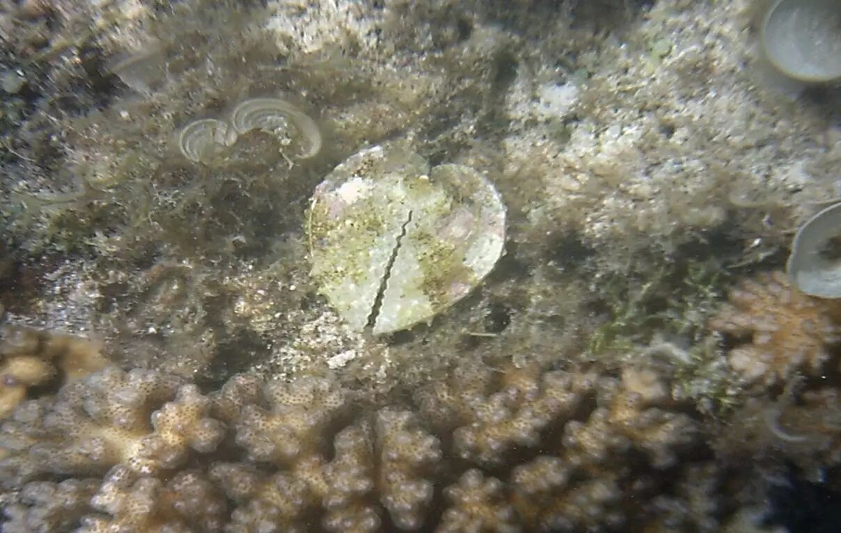 镶嵌生活在滨珊瑚中的某种心鸟蛤(Corculum sp.)。图片:reef builders