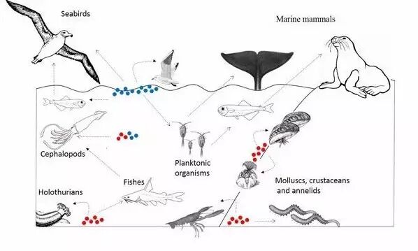 微型塑料颗粒在海洋生物食物链中的传递。图片:moocs.southampton.ac.uk