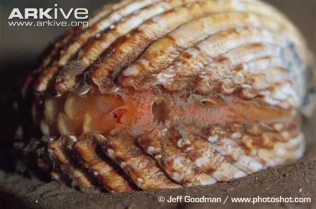 心鸟蛤水进出水孔伸出来的样子,和这只鸟尾蛤(Cerastoderma edule)相似。图片:Jeff Goodman / arkive