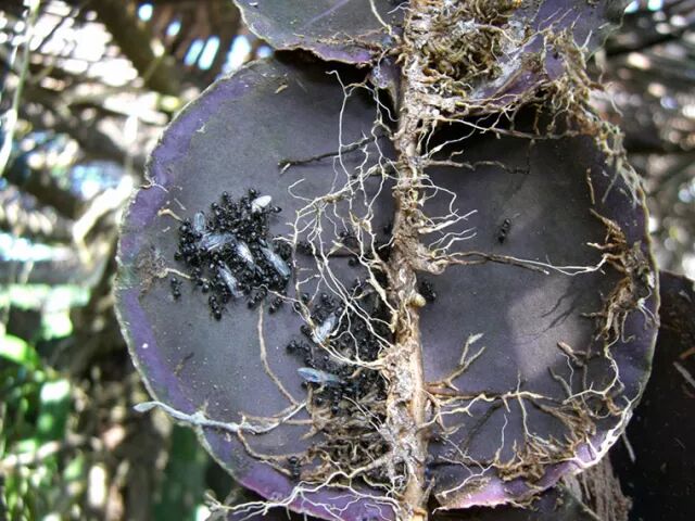 当然,这“锅贴皮”包着的可不是什么可口的“馅料”,而是一群群蚂蚁和蚁冢昆虫(myrmecophile animals 蚁类的客居或寄生昆虫)。这种球兰和昆虫们形成了一种共生关系:宽大的肉质叶为昆虫提供了庇护所,供其生存和繁殖,反过来,昆虫们产生的代谢物可以被叶背的网络根系所吸收。