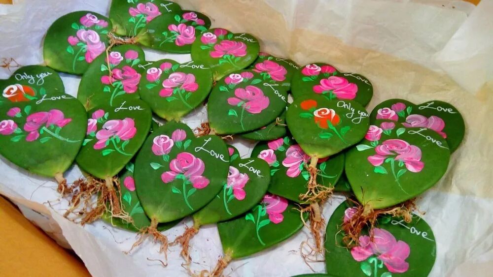 这其实也是一种球兰,其名字叫心叶球兰Hoya kerrii。它拥有厚实多肉的革质叶片,有个自然的缺刻,看起来就像是一颗爱心。正因这样,它们成为了为数不多的一种观叶球兰,商家为了快速出货,会摘取它们的叶片,等伤口晾干后插进介质中培养,不久便会生根。