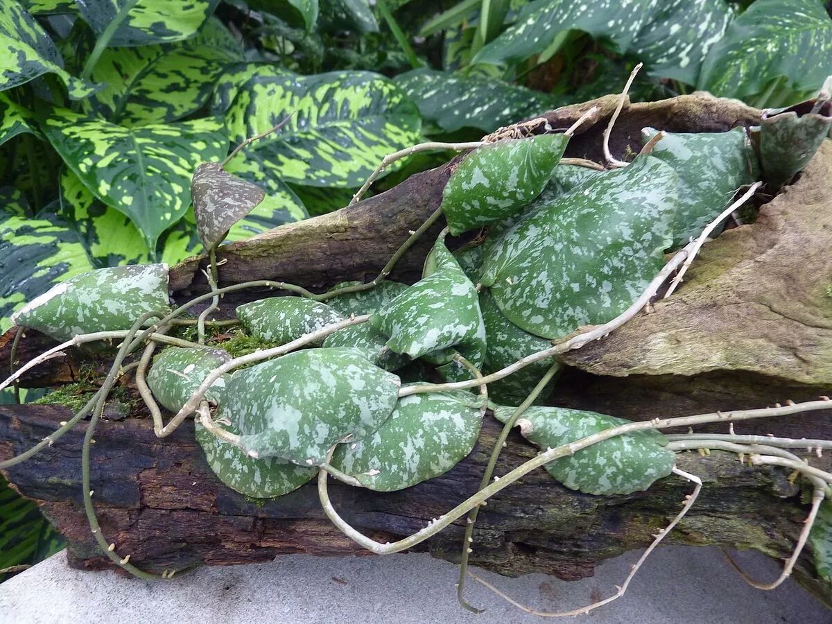 还有一种球兰的叶片长得像锅贴,这种学名叫Hoya imbricata的球兰也被人们称为“龟壳球兰”。它的叶片呈圆形,直径可达25cm,足有一个多肉君的巴掌脸大,斑驳的叶片上有着银色和紫色相间的不规则花纹。外观看起来就很奇特,而其生性更令人称奇——它的叶片会紧贴附着物攀爬生长,的确是像乌龟趴着的模样;如果附着物很细长,叶子就喜闻乐见地蜷成锅贴状。
