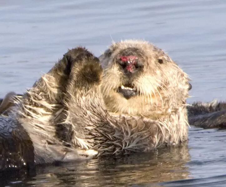 在交配时,雄性海獭还会咬伤雌性海獭的鼻子并给她留下一道伤疤。图片:Mike Baird / wikipedia