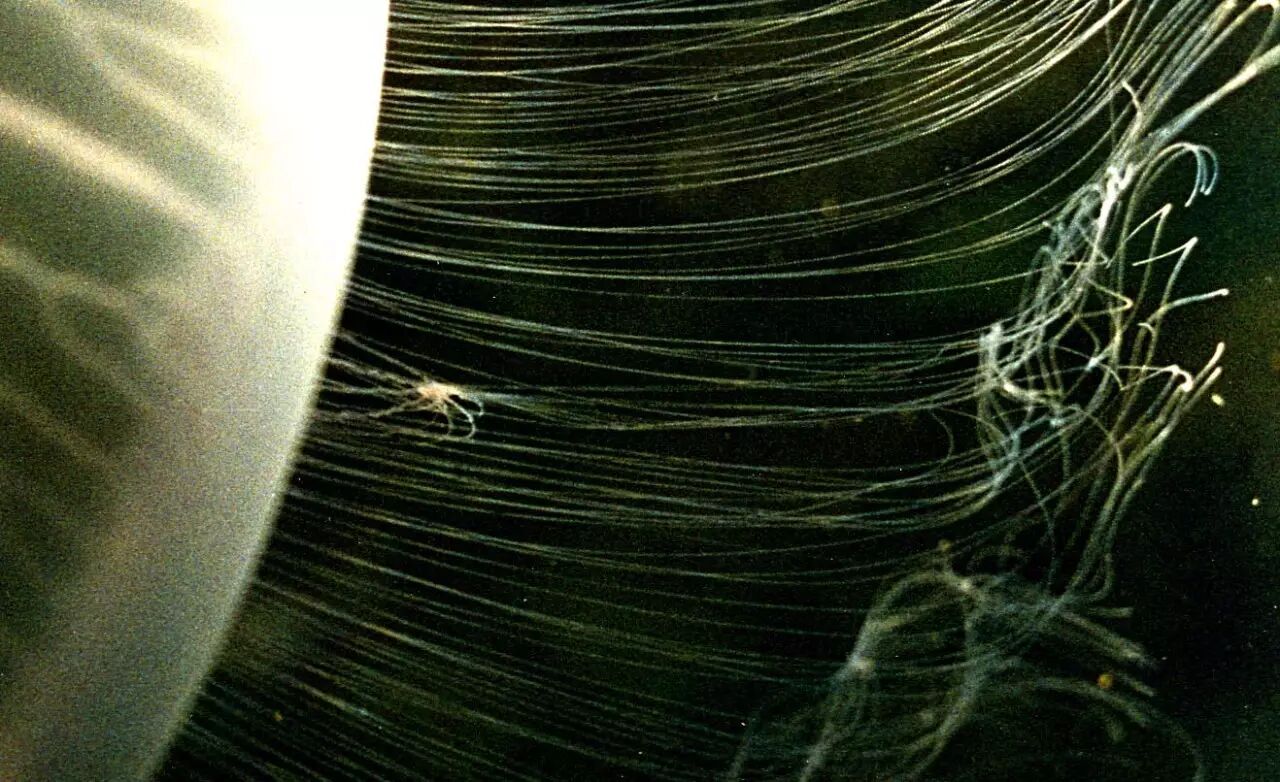 维多利亚多管发光水母的伞状体边缘,还有很多长短不一细丝状的触手,在海流中波动摇曳,简直撩人。然而,不要小看这些触手,触手上有防御和捕食专用的刺细胞,一旦小型的浮游动植物和一些小型的水母触碰到这些刺细胞,就会触发刺细胞翻出它的刺,以蜇住猎物,附近的其他触手也会赶过来,将猎物团团包围并送到口中。