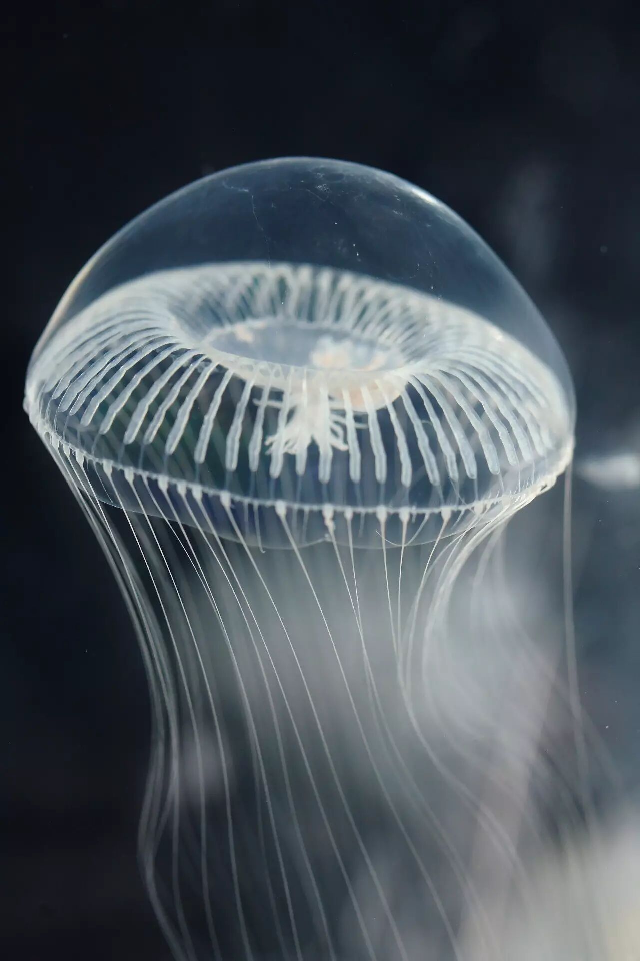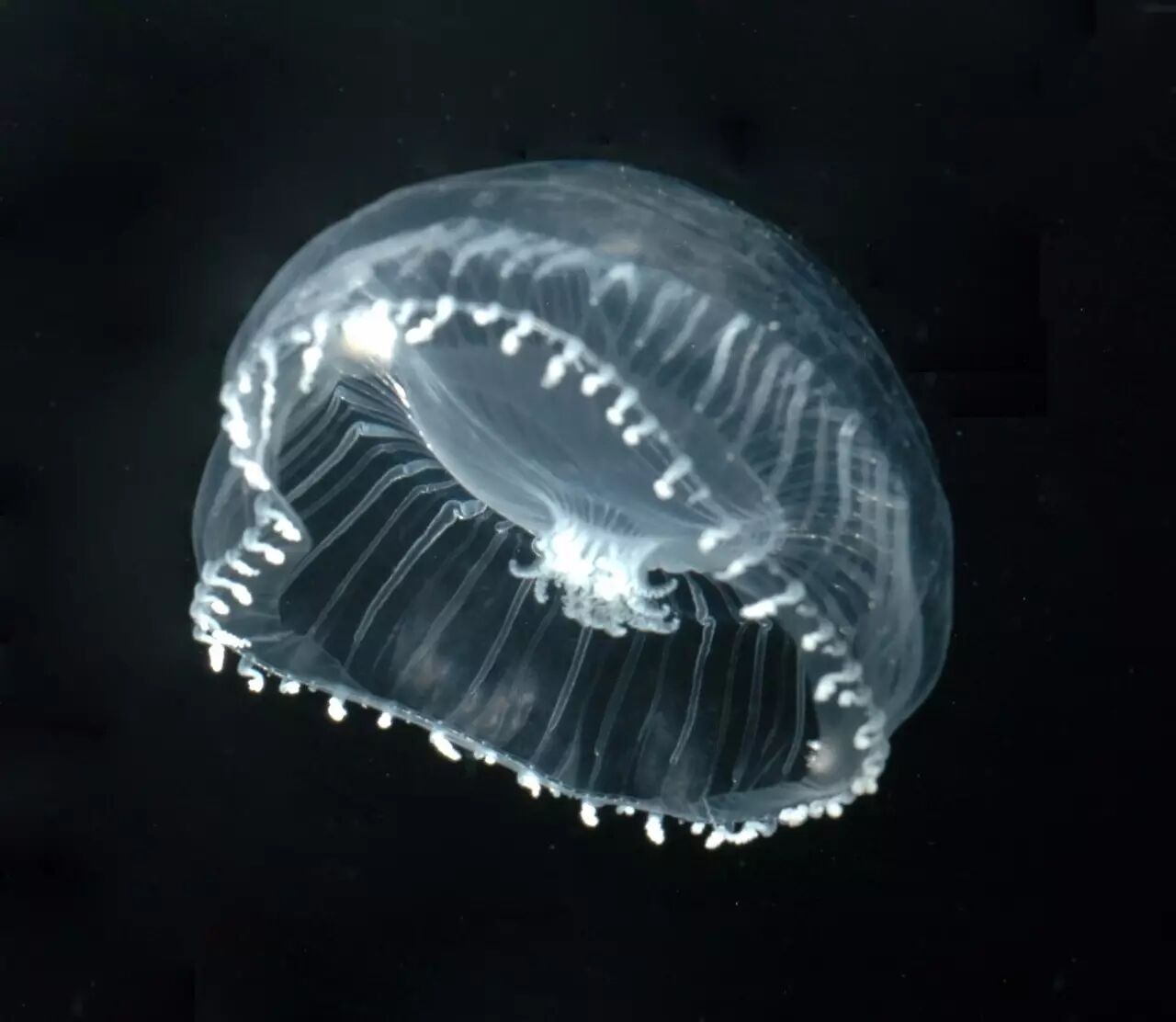 不发光的时候,维多利亚多管发光水母(名字要长长长长……)看上去比较普通。它们的直径能达到10cm左右,全身光滑透明,活生生就是一个透明的剪掉了“脚”的香菇。这个香菇模样的部分是水母的伞状体;维多利亚多管发光水母的口的边缘,有多达100多条向伞状体边沿辐射延伸的辐管,“多管”之名就来源于此。