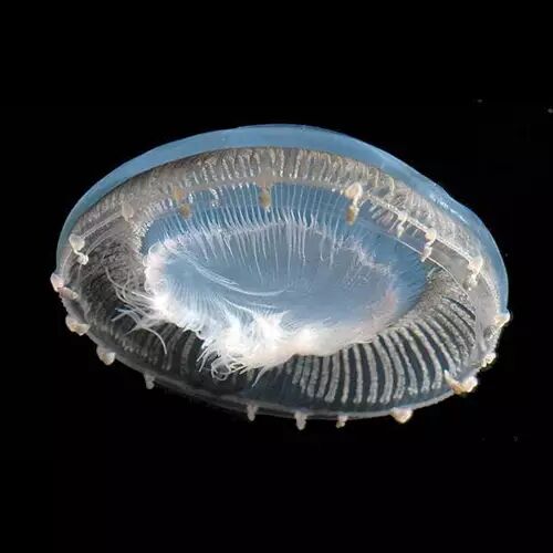 和普通蘑菇不同,这种“蘑菇”的腹面有一个可以高度收缩的口,像被绳子绑着的大麻袋口一样——学术上叫做“伞状体下缘具有肌肉缘膜”——这也是水螅纲水母所特有的结构*。在遇到捕食者和需要去“追逐”捕食食物的时候,这个结构就可以用来帮助游泳。但这个结构的主动运动能力还是比较弱的,海流的方向和速度才是影响它们运动的决定性因素。