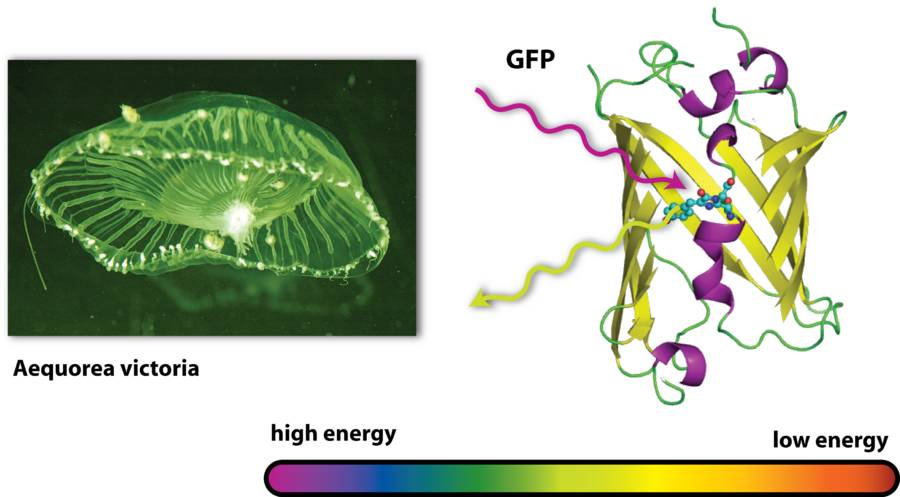 GFP在下村脩和约翰逊在提取纯化水母素的时候就被发现了,当时的描述是“在阳光下呈绿色、钨丝灯下呈黄色、紫外光下则会发出强烈的绿色”。但直到1974年,GFP才真正被他们从维多利亚多管发光水母中提取出来。与水母素所需要的发光条件不同,GFP只需要紫外线和蓝色光的照射,就能发出绿色的光。也正因这种特殊性质,GFP引起了很多生物学家的关注。
