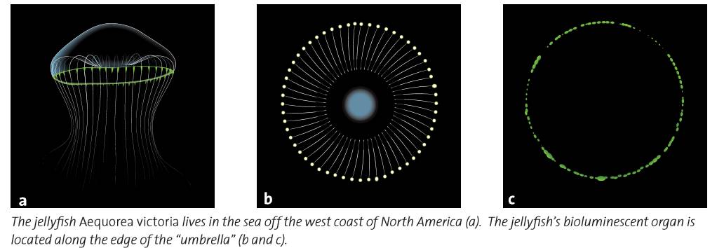 荧光素—荧光素酶系统是很多发光生物最常用的发光方式,发光器官内的荧光素在荧光素酶的催化下会释放出可见光。荧光素—荧光素酶发出的光大多是蓝色的,其实,维多利亚多管发光水母也有个发蓝光的过程,这是由其体内的水母素(Aequorin)发出来的。