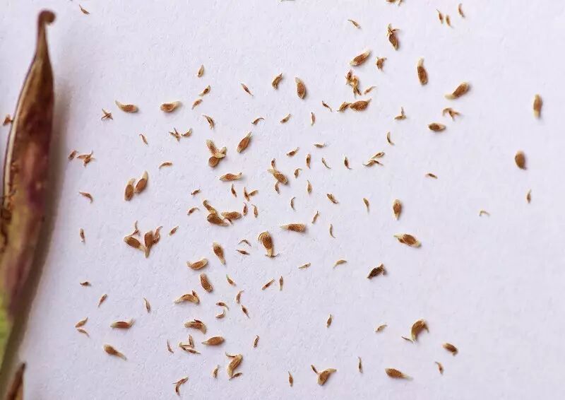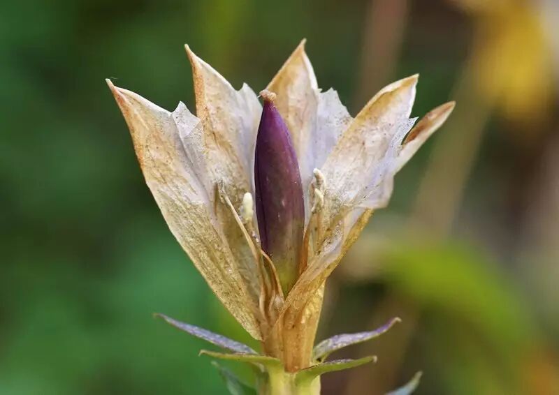 龙胆的花冠在结果后也不脱落,反而会收拢闭合到一起,椭圆形的蒴果就藏在里面发育,两个心皮的尖端微微翻卷,成熟后开裂成两瓣,释放出带有小翅的纺锤形种子。
