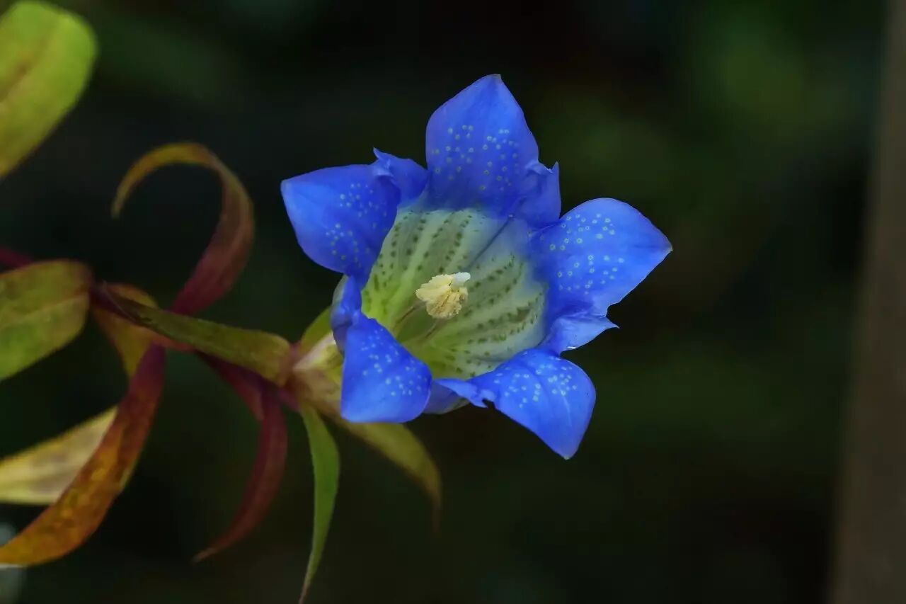 龙胆花的颜色其实不是纯蓝,它的喉部往往有不少黄绿色的斑点,花冠上半部也经常是蓝紫色上有浅色小点,仿佛夜空中的点点繁星。它喜欢在阳光明媚时开放,阴天下雨时一般是关闭状态,这种晴开雨闭的特性,有助于保证传粉的效率,毕竟下雨时候昆虫不怎么出来采蜜,开展的花冠也容易落进去雨水。