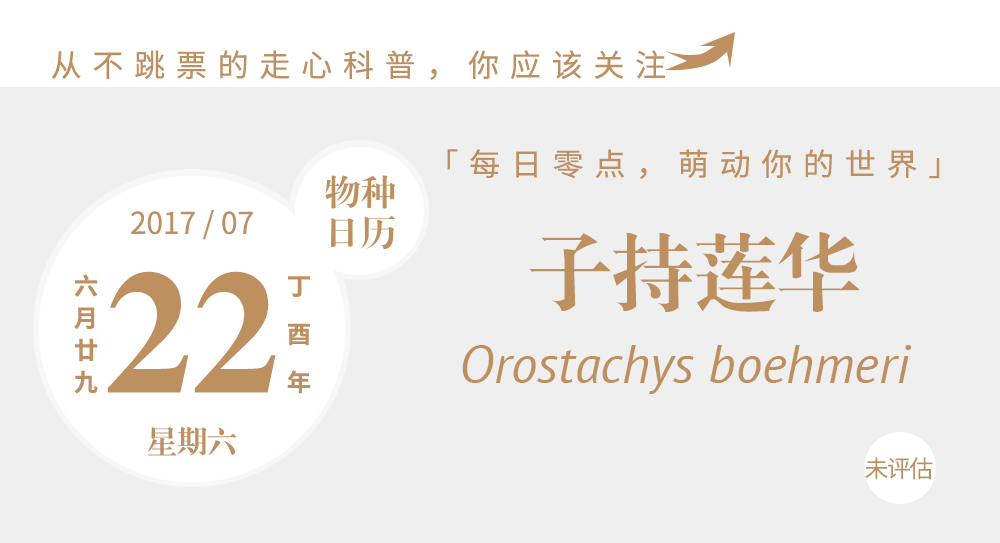 子持莲华的学名是Orostachys boehmeri ,景天科、瓦松属的一种多肉植物,原产于日本,分布在本州北部和北海道的高海拔山区。瓦松属(Orostachys)大家可能比较陌生,属名由希腊语oro(山)和stachys(穗状)组成,意为在山地生长而盛开穗状花序的植物。