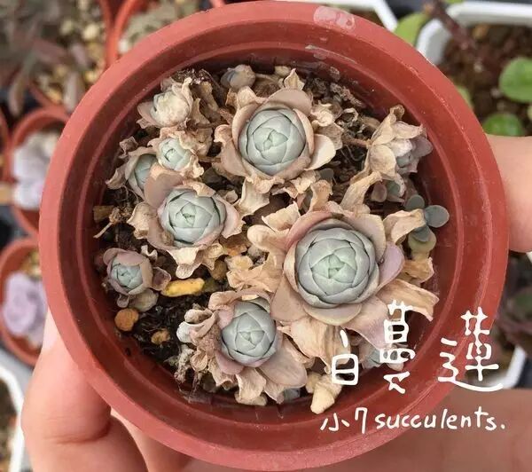 别担心,这是它们本来该有的面貌。子持莲华在秋冬时节,由于昼夜温差大、日照较强,它们的叶片会变得短而厚,会略微呈现出淡淡的粉色,这就是它们颜值最高的时候啦。如果持续低温,它们便会进入到休眠状态,外围的几圈叶片会干枯,中心的叶片变得短而小,排列得非常紧凑。瓦松属植物一般生活在高海拔地区,这是它们应对低温胁迫的适应法则,子持莲华也不例外。