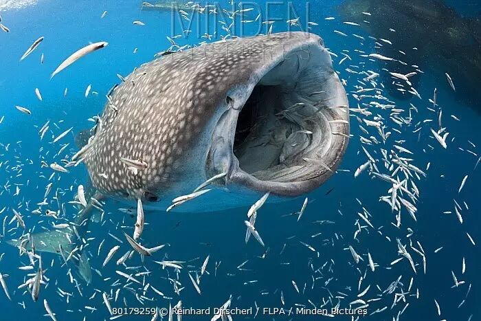 鲸鲨是一种依赖嗅觉觅食的滤食性鱼类,主要以浮游生物、藻类、磷虾、漂浮的鱼卵及小型鱼类为食。鲸鲨捕食时会张开大嘴深吸一大口海水,闭合嘴巴和打开鳃片的短暂瞬间,滤掉海水筛出食物,任何被鳃条间过滤器官所阻隔的小型生物都会被鲸鲨一口吞下。