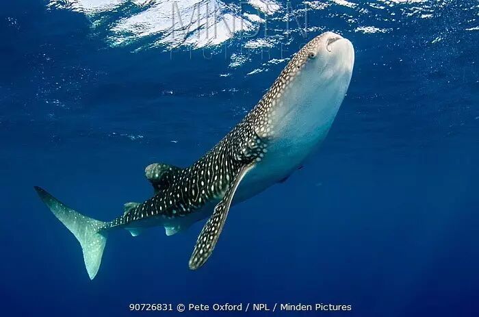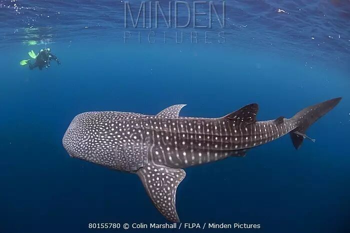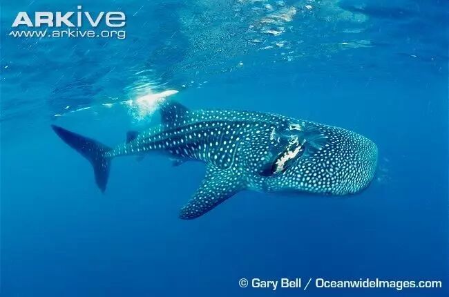 鲸鲨鳃裂后侧和胸鳍上方的斑点是它的识别特征。图片来源见水印