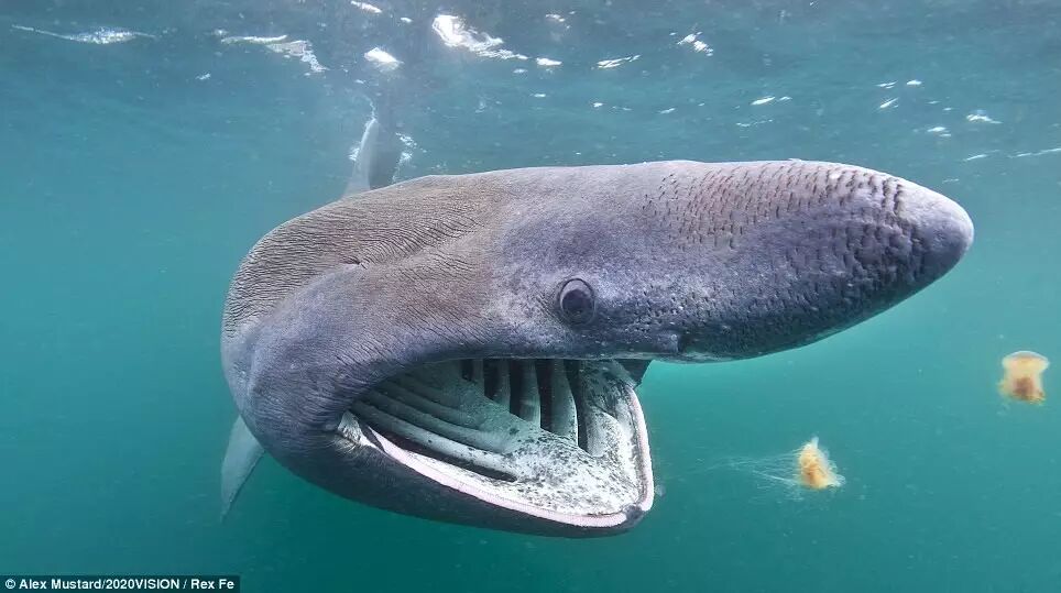 同样大口滤食的还有姥鲨,它们是个头仅次于鲸鲨的大鱼。图片:Alex Mustard / Rex fe