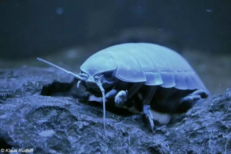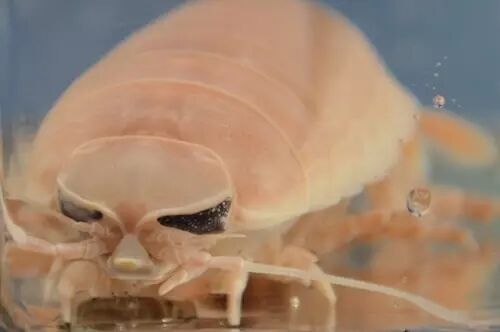 大王具足虫嘛,长得就像放大版缩头鱼虱,所以就躺枪了,谁叫它俩都是等足目的兄弟呢~前面也说过大王具足虫看起来超凶,但事实上,它们是食腐动物,在深海的淤泥中,如同清洁工一样吞食有机物碎屑,如动物尸体等,不过也有报道它们会主动怼鲨鱼。