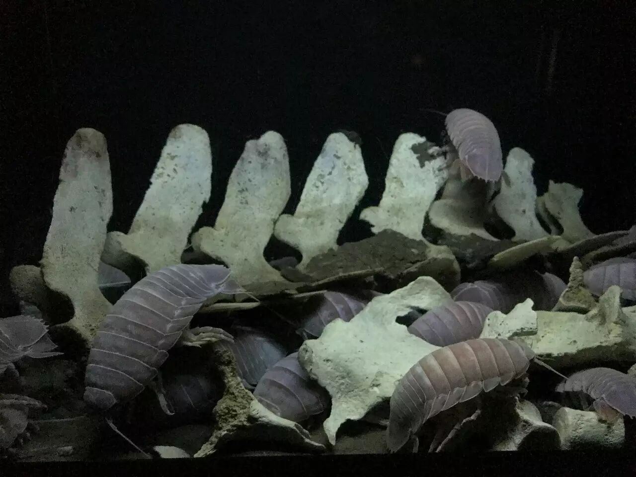 早些年由于认识匮乏,偶随商业捕捞上岸的大王具足虫,一般都会被忽视丢弃,然而今非昔比,活体大王具足虫已逐渐成为水族馆的“座上宾”。今年的4月底,我去冲绳的美丽海水族馆,人生第一次见到活的具足虫——并非大王,而是道氏深水虱Bathynomus doederleini,但能亲眼见到这群生灵,在只有8℃的海水缸里群集觅食,不仅是心满意足,还有莫名的感动!