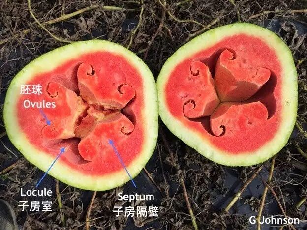这是因为整个西瓜其实是由3个心皮发育而来的,而这也是大部分葫芦科植物果实,包括甜瓜、黄瓜、冬瓜等等的特点。心皮是什么?植物学上的定义是,指具有生殖功能的、变态的(不要想歪)叶。有经验的切瓜者会巧妙地沿着着生种子的地方来分瓜,这样就能得到好几瓣几乎不含籽的瓜块了。