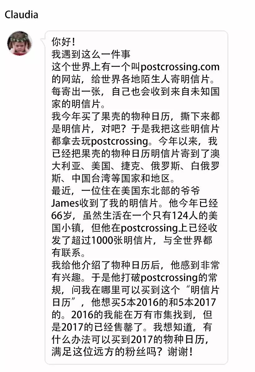 去年一整年,日历娘收到并回复了数千张明信片。当时就在想,这么多喜爱自然的小伙伴,只能和我们交流,是不是远远不够?这次Claudia朋友让日历娘意识到:为什么不让大家互相交换明信片,结交笔友呢?你们需要的桥梁,物种日历来搭建!(๑•̀ㅂ•́)و✧