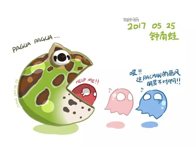 这是80年代风靡一时的街机游戏——吃豆人(Pacman)。玩家操控一个缺了一角的黄色圆饼,在复杂多变的地图里躲避五颜六色的鬼魂,并将所有的豆子吃光光。游戏简单易上手,又充满了趣味性,永远张着大嘴的黄色圆饼形象深入人心。今天的日历主角,英文俗名“Pacman frog”,没错,就是蛙中的“吃豆人”——角蛙。