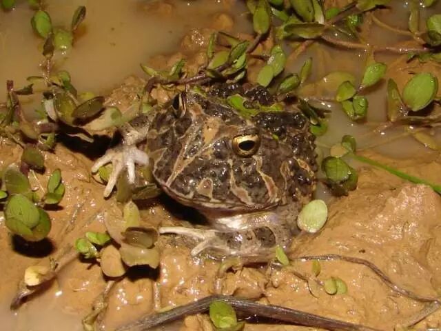 作为角蛙家族中的一员,钟角蛙(Ceratophrys ornata)原生分布在南美洲中部的阿根廷、乌拉圭、巴西的草原地区。其成体身体大小接近一个圆盘,直径在10厘米上下,雌性成体的体型会比雄性大2厘米左右。