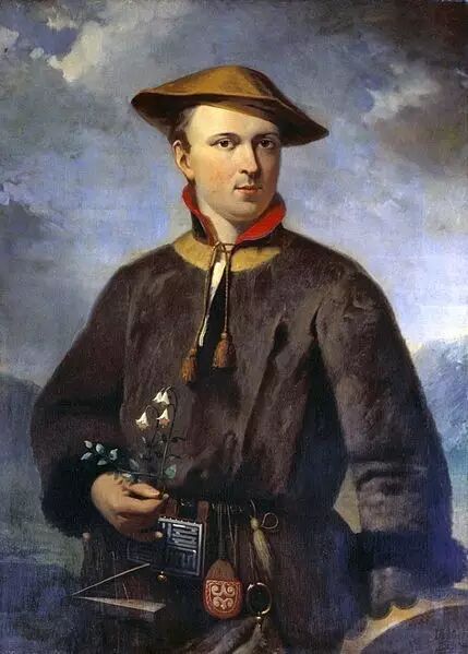 年轻的林奈哟,你打扮成拉普兰的萨米人,拿的是这朵北极花,还是那朵南极花(并没有)呢?图片:Hendrik Hollander (1853)