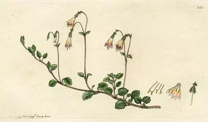林奈与北极花结缘已久。他出生时,瑞典在与俄罗斯的北方霸业争夺中落败,王权动摇、国内自由化运动兴起、科学与理性已经萌芽,在这种氛围中长大的林奈,从年少时就醉心于植物研究(虽然他为了生活,学了医)。1732年,25岁的林奈到瑞典和芬兰北部的拉普兰地区(Lapland)考察,按照萨米族原住民的生活方式深入了解当地物种,那里的北极花就成了他的真爱之一,大概因为两朵小花看上去非常对称(林奈的另一个真爱是代表辐射对称的七瓣莲,<戳这里>复习)。