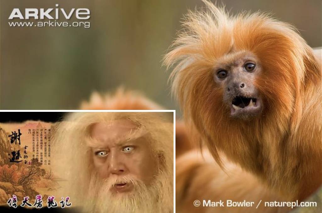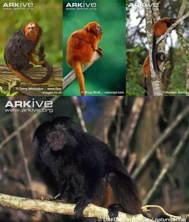 至于金狮面狨所在的狮面狨属, 顾名思义都像金狮面狨一样有着狮子鬃毛般的发型,面部无毛。这个属的四个物种念名字如同背心经:金狮面狨、金头狮面狨、黑狮面狨、黑头狮面狨。