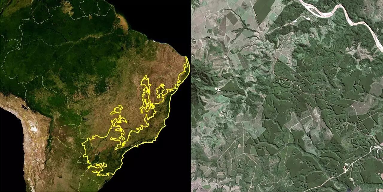 左图:世界自然基金会给出的大西洋沿岸森林带范围。图片:Miguelrangeljr / Wikipedia;右图:大西洋沿岸森林带的碎片化。图片:Cnes / Wikipedia