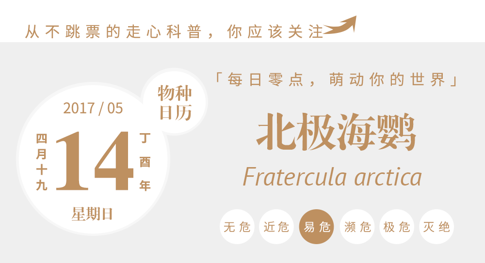 虽然海鹦现在还不是濒危物种,每年依然会有大量的海鹦如约出现在北陆,但海鹦的远亲大海雀的悲剧依然历历在目。同样呆萌的大海雀从来没见过人类的世面,站着让人捕,就是这样生生被整个捕灭绝了。幸运的海鹦能飞高、能迁徙,因此一直保持着数量稳定,但在捕猎之后,还有栖息地丧失和食物链断裂的威胁,以及人类带来的入侵动植物对它们巢穴的破坏。