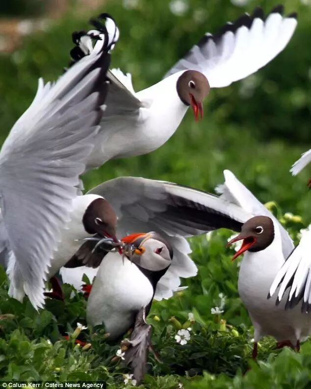 试图从争夺中保卫食物的北极海鹦。图片来源见水印