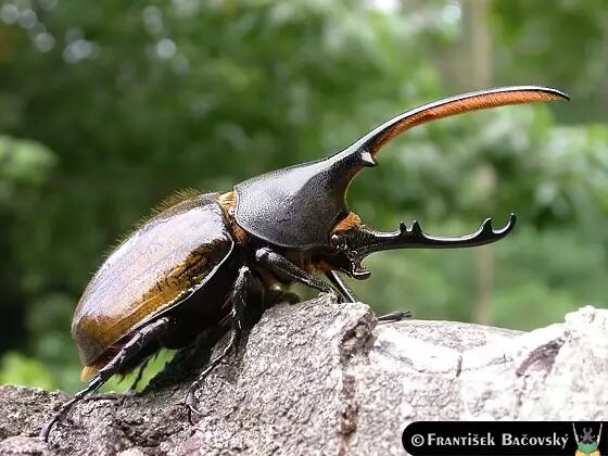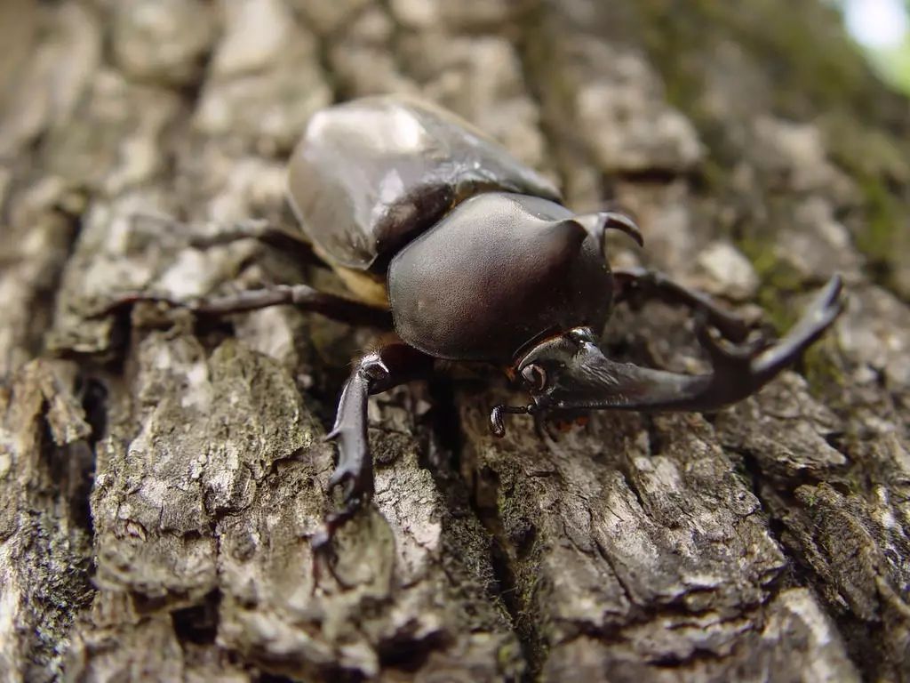 要说分布最广,也最让人熟悉的大甲虫,独角仙排得上第一个。在分类上,独角仙属于鞘翅目犀金龟科,包括了很多类似模样的虫子,最正牌的一种,是双叉犀金龟(Allomyrina dichotoma)。它身披棕红色的坚硬外壳,雄虫头部长耸着标志性的二叉状大角,前胸还有一只小角,六足粗壮有力,威猛光亮,惹人喜爱。
