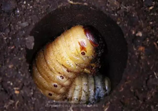 独角仙的幼虫是典型的蛴螬型幼虫,刚孵化时小而柔软,头壳直径只有3mm,弯曲成C字型,靠吸收土壤的腐殖质补充营养。幼虫蜕两次皮转为三龄幼虫。三龄幼虫的任务就是积聚脂肪,蛰伏在地下度过寒冷的冬天。