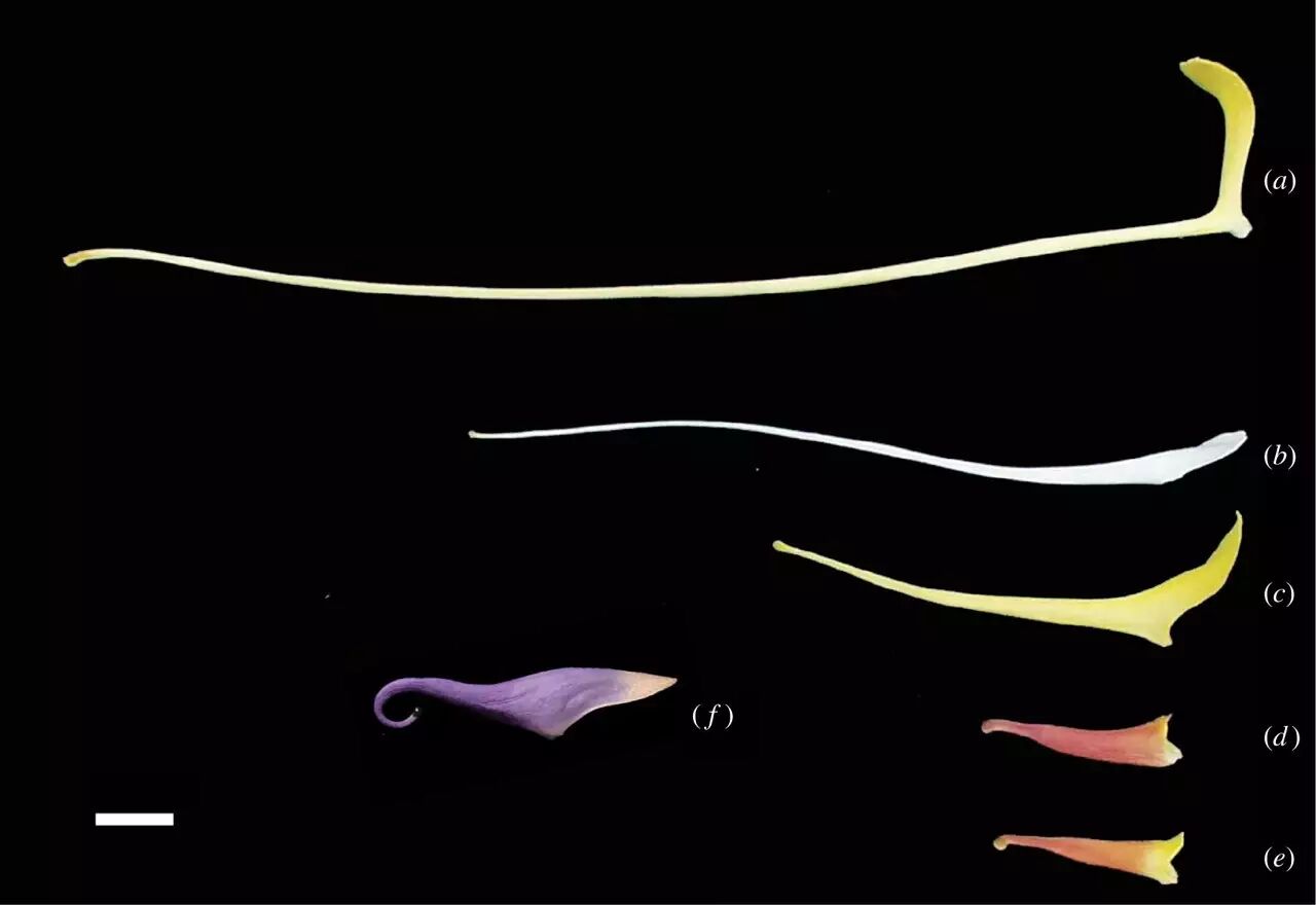 不同种耧斗菜的距。图片 Kramer E M / Philosophical Transactions of the Royal Society of London B: Biological Sciences(2010)