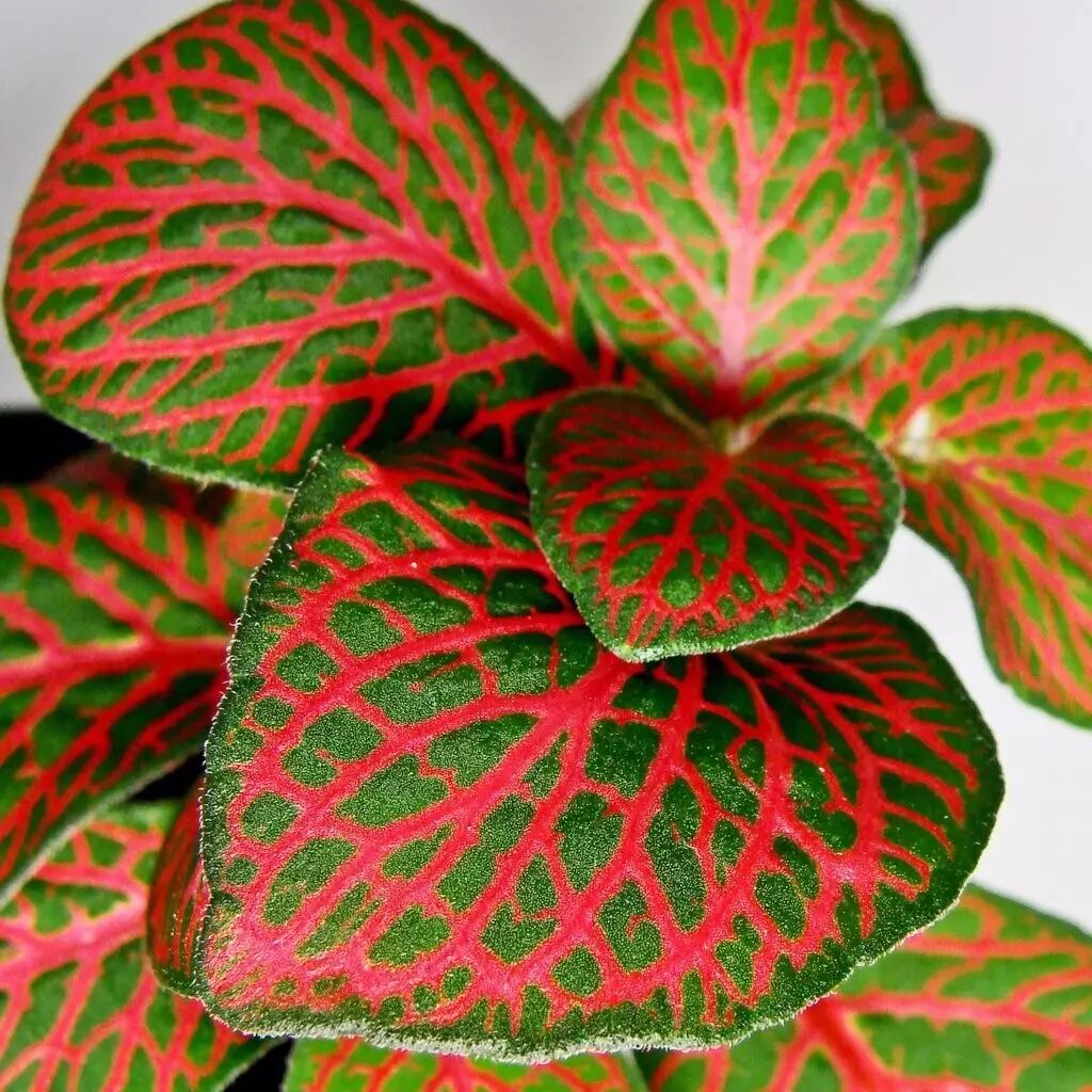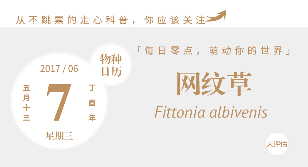 网纹草最显眼的标志就是它的叶子,十字形对生的卵圆形叶片上布满了网状花纹,仔细看的话会发现它实际上是叶脉部分具有明艳的颜色,种加词albivenis就是由albus(白色)加vena(叶脉)构成的。网纹草的品种有很多,常见的是叶脉白色的白网纹草和红色的红网纹草,过去它们曾被认为是两个独立物种,拥有各自的学名F. argyroneura和 F. verschaffeltii,后来被归并成了一个物种,有了现在通用的学名Fittonia albivenis。