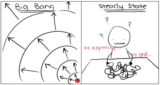 并非所有的宇宙理论都像大爆炸学说(左图)一样认为宇宙有开端;另一些理论(比如右图的稳恒态理论)认为宇宙无始无终。图片:Poundforabrown - WordPress.com