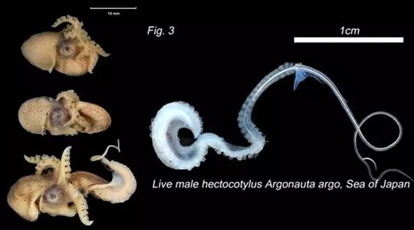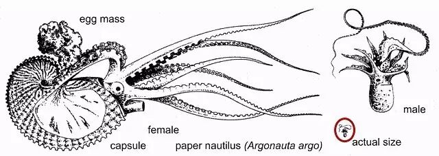 更悲伤的是,雌性船蛸的奇特习性很早就为人所知,而雄性船蛸的样子直到19世纪末才被描述——生物学家们一度以为:雌性体内的茎化腕,不过是寄生虫罢了。