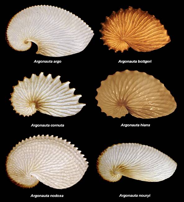 船蛸属不同成员的“外壳”。图片:wikipedia