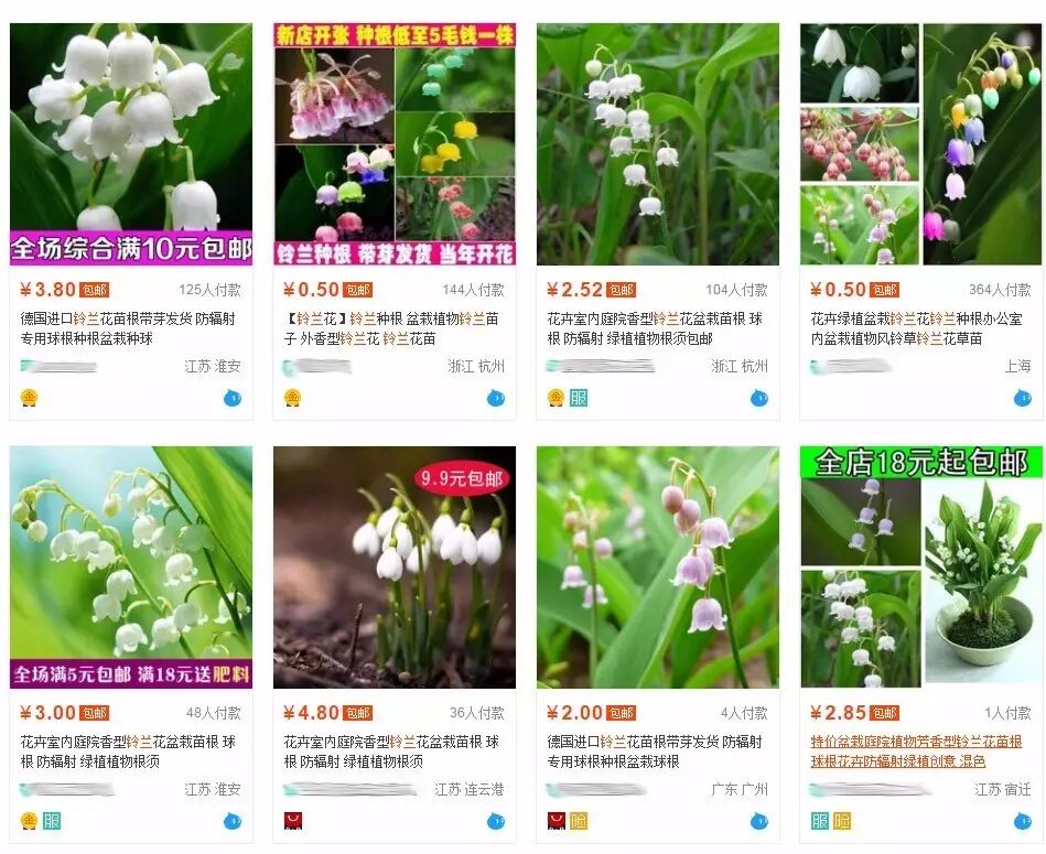 比如,前天沙漠豪猪老师的文章里提到了铃兰<戳这里>,好多人说“可爱!”于是你到网店一搜,从第一页的搜索结果里随便截个图……