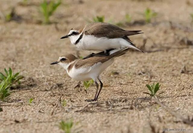 一只雄性环颈鸻(上)和一只雌性环颈鸻(下)正在交配。雄性个体有明显的黑色领圈和眼纹,雌性个体颜色较为暗淡,颈部没有黑色领圈。图片:google