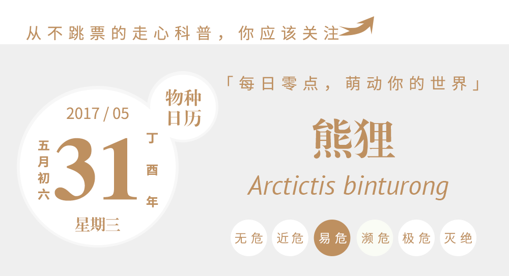 今天我们要介绍的这位萌物,完美cos黑衣人……在它的家族中,熊狸(Arctictis binturong)是唯一身披一袭黑衣的。它的耳朵边缘有一圈白,耳背上翘起长长的、类似猞猁的簇毛。棕色的小豆眼之上,是两团模糊不清、表情阴沉的“眉毛”。
