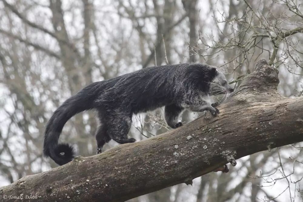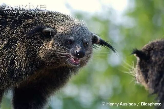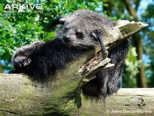 它如果长胖一点,身材会像熊,拉长一点就像鼬[yòu]。体重9~20kg,体长(不算尾巴)60~90cm,大尾巴与身体等长。它像人一样,用后脚的整个脚掌走路,而不像阿猫阿狗那样“踮着脚尖”。比起Binturong这个英文名,它还有一个更好记的别称,Bearcat。