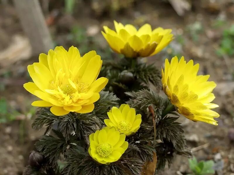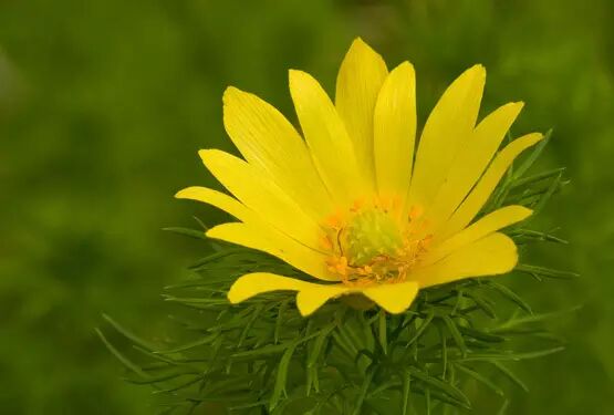 菟葵花期将结束时,侧金盏花就接棒绽放了。每年三四月份,在东北一望无际的雪原上,绽放着一轮轮小太阳般金灿灿的花朵,反射着刺眼的阳光;它们细裂如同茴香的叶子紧紧皱缩,贴在花后方。这顽强而充满朝气的野花就是侧金盏花。