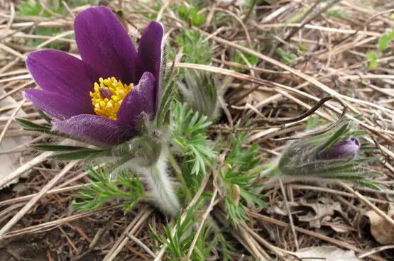 白头翁叶全部基生,总苞片基部合生,顶端掌状裂;总苞片之上就是紫色的大花了,紫色的萼片和鲜黄的花药相映,十分醒目,说它是早春时节花朵最大的野花之一也不为过。