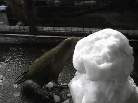 动物园里的啄羊鹦鹉,正在破坏一个雪人。图片截取自Youtube