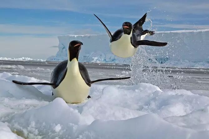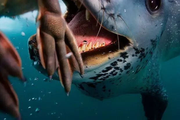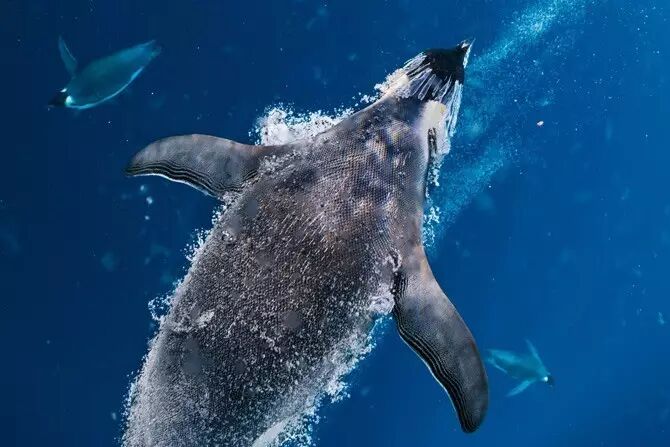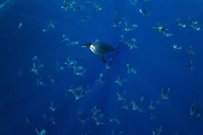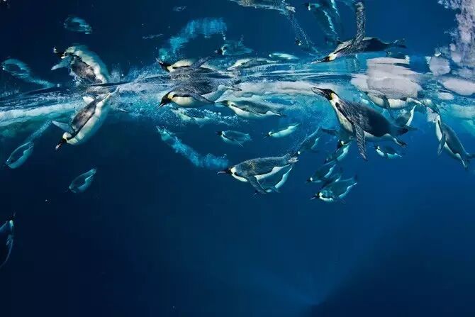海里的那些企鹅照片是咋拍摄的?这些鸟类的行为是可预估的,它们回到陆地的时间、位置都可以推测。这位摄影师,应该是在预估的区域蹲点,发现企鹅要回来时下水拍摄的。他拍摄的画面是如此细腻、清晰,你可以在企鹅身上看到许多微小的气泡。这些气泡可以用来迷惑它们的天敌。