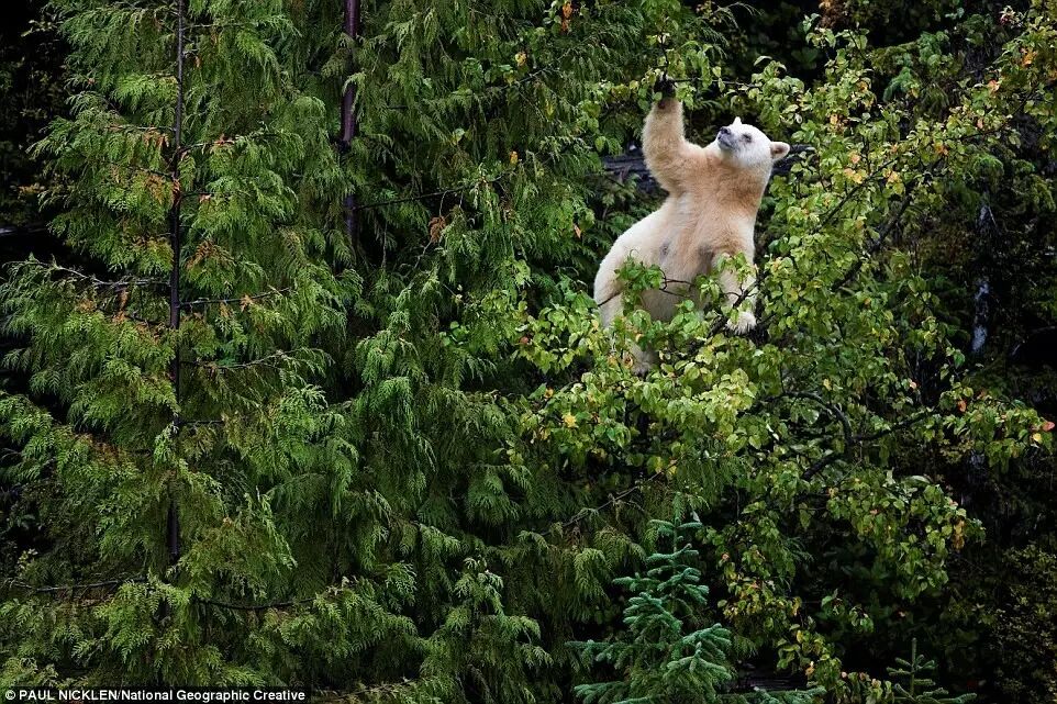 加拿大有一类非常特殊的熊,叫柯莫德熊(Ursus americanus kermodei),它们是美洲黑熊的一个亚种,但看起来很像北极熊,因为它们是白的。它们的白色不是白化病,来源于稳定遗传的隐性基因,而这身白皮让它们更擅长抓鱼。这种熊在原住民文化里非常重要,被称为灵熊(spirit bear)或鬼熊(ghost bear)。当这种白色的动物出现在在绿色的森林中时,画面非常玄幻: