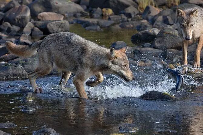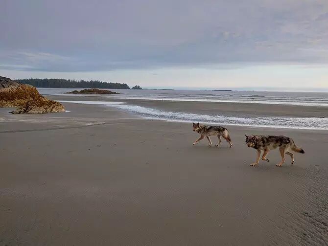 在加拿大的不列颠哥伦比亚,有一个灰狼群体被称为海狼(sea wolf)。它们会抓鱼,还会猎杀海豹和海狮,甚至能够游着泳在岛屿之间迁徙。这样的行为,让它们拥有了一些独特的特征,毛皮和体型都和一般的狼不一样。保罗·尼克伦的海狼系列也非常精彩,但不知为何,他没有拍摄他特别擅长的水下照片: