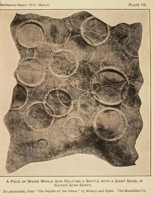 一块布满圆形伤痕的抹香鲸皮肤。这些伤痕应当是巨型乌贼的吸盘所致。图片:Smithsonian Report 1916