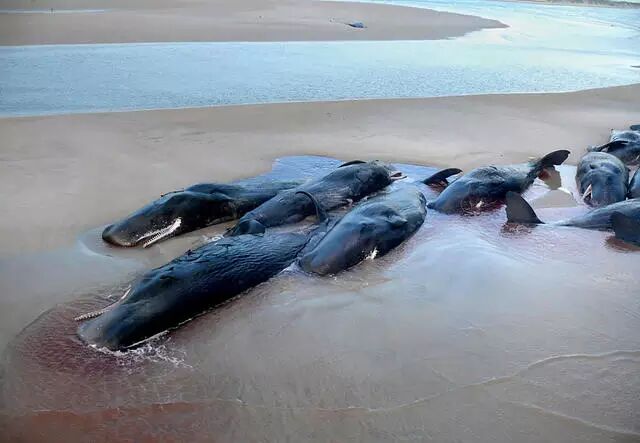 鲸为什么要毅然决然地离开温柔的水,冲上浅滩,看上去像是一心求死呢?最容易理解的一个原因是它们因为伤病失去了行动能力,才被潮水冲上岸。确实,在很多搁浅的鲸身上能看到被鲨鱼和虎鲸攻击的伤口,或者是被船只高速旋转的螺旋桨打上的“花刀”。很多鲸类搁浅事件跟赤潮爆发可以吻合,赤潮发生时大量藻类产生的毒素在食物链中富集,最终导致鲸类中毒。